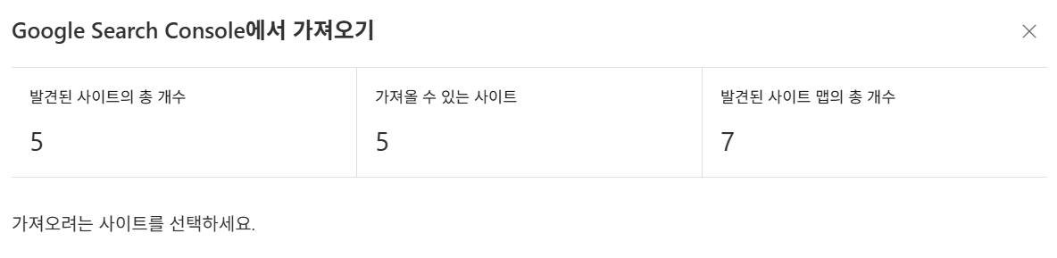 빙 웹마스터 도구 구글 서치 콘솔 5. 구글 서치 콘솔에 등록된 사이트 목록 중 Bing에 등록할 사이트를 선택하고 가져오기를 누르면 끝납니다.